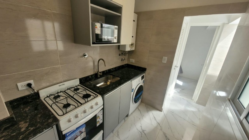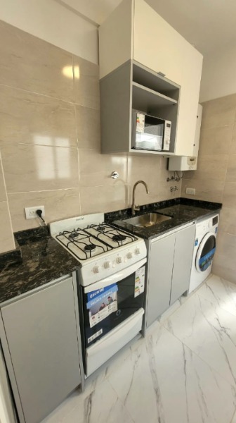 Cocina revestida en cerámico, con artefacto de cocina, heladera, lavarropas, calefón y microondas.