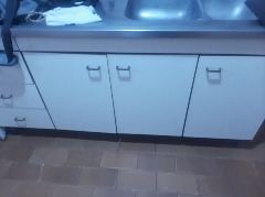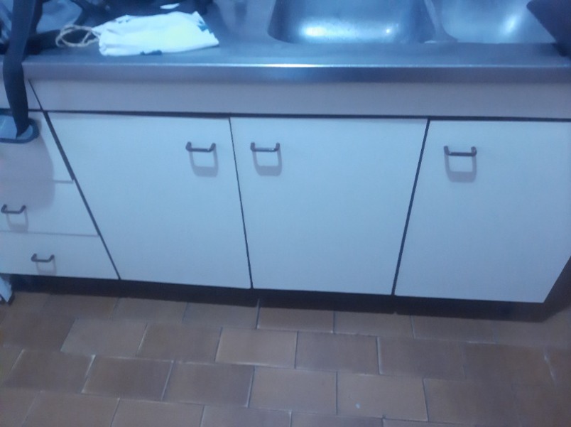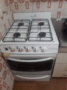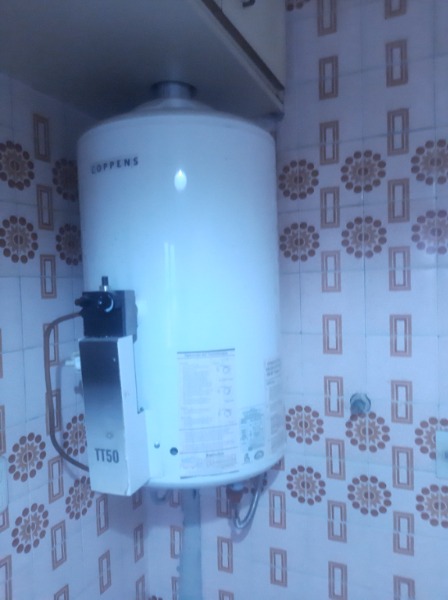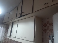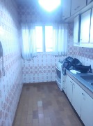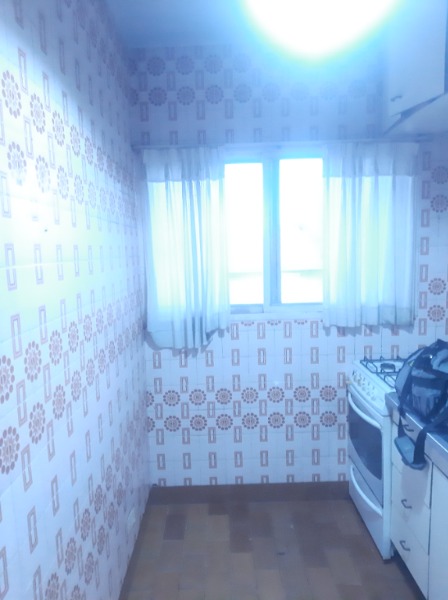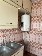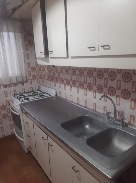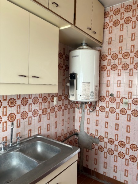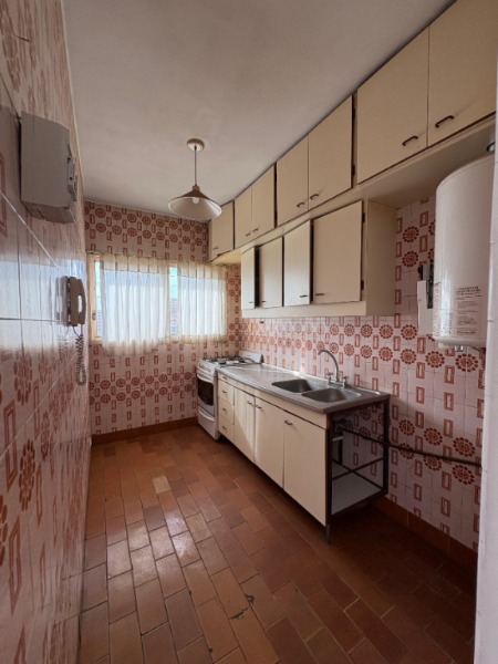 Cocina a la calle con ventanal, alacenas y bajo mesada, artefacto de cocina y termotanque.