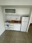 Cocina con revestimiento, artefacto amoblamiento y heladera a estrenar.
