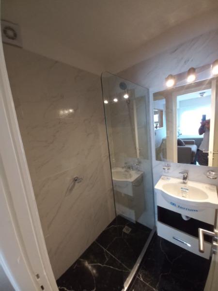 Baño completo (2.10 x 1.75) revestido en porcelanato con mampara.